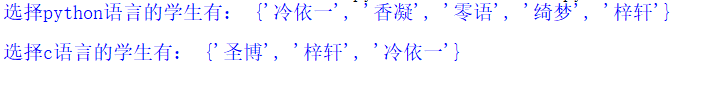 1 python = {'绮梦','冷依一','香凝','梓轩'} 2 c = {'冷依一','零语','梓轩','圣博'} 3 print('选择python语言的学生有:',python,'\n') 4 print('选择c语言的学生有:',c)
