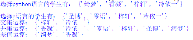 1 python = set(['绮梦','冷依一','香凝','梓轩']) 2 c = set(['冷依一','零语','梓轩','圣博']) 3 print('选择python语言的学生有:',python,'\n') 4 print('选择c语言的学生有:',c) 5 print('交集运算:',python&c) 6 print('并集运算:',python | c) 7 print('差值运算:',python -c)