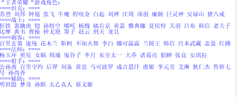 1 print("“王者荣耀“游戏角色:") 2 print("====坦克:====") 3 tank = ["苏烈","刘邦","钟馗","张飞","牛魔","程咬金","白起","刘禅","庄周","项羽","廉颇","巨灵神","安禄山","猪八戒"] 4 for i in tank: 5 print(i,end=" ") 6 print("\n"+"====战士:====") 7 zhanshi = ["狂铁","裴擒虎","铠","孙悟空","哪吒","杨戬","橘右京","亚瑟","雅典娜","夏侯惇","关羽","吕布","韩信","老夫子","达摩", 8 "典韦","曹操","钟无艳","墨子","赵云","刑天","龙且"] 9 for i in zhanshi: 10 print(i,end=" ") 11 print("\n"+"====刺客:====") 12 cike = ["百里玄策","庞统","花木兰","靳柯","不知火舞","李白","娜可露露","兰陵王","韩信","宫本武藏","盖聂","红拂"] 13 for i in cike: 14 print(i,end=" ") 15 print("\n"+"====法师:====") 16 fashi = ["杨玉环","奕星","女娲","周瑜","鬼谷子","芈月","东皇太一","大乔","诸葛亮","貂蝉","张良","安琪拉"] 17 for i in fashi: 18 print(i,end=" ") 19 print("\n"+"====射手:====") 20 sheshou = ["公孙离","百里守约","后羿","刘备","黄忠","马可波罗","成吉思汗","虞姬","李元芳","艾琳","狄仁杰","鲁班七号","孙尚香"] 21 for i in sheshou: 22 print(i,end=" ") 23 print("\n"+"====辅助:====") 24 fuzhu = ["明世隐","梦奇","孙膑","太乙真人","蔡文姬"] 25 for i in fuzhu: 26 print(i,end=" ")