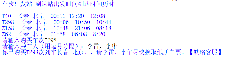 1 biaotou = ["车次","出发站-到达站","出发时间","到达时间","历时"] 2 checi = ["T40","T298","Z158","Z62"] 3 chufa_daoda = ["长春-北京","长春-北京","长春-北京","长春-北京"] 4 start_time = ["00:12","00:06","12:48","21:58"] 5 daoda_time = ["12:20","10:50","21:06","06:08"] 6 lishi = ["12:08","10:44","08:18","8:20"] 7 for i in biaotou: 8 print(i,end="") 9 print("\n") 10 print(checi[0],'',chufa_daoda[0],'',start_time[0],daoda_time[0],'',lishi[0],'') 11 print(checi[1],'',chufa_daoda[1],'',start_time[1],'',daoda_time[1],'',lishi[1],'') 12 print(checi[2],'',chufa_daoda[2],'',start_time[2],'',daoda_time[2],'',lishi[2],'') 13 print(checi[3],'',chufa_daoda[3],'',start_time[3],'',daoda_time[3],'',lishi[3],'') 14 chufa_chx = dict(zip(checi,chufa_daoda,)) 15 start_time_chx = dict(zip(checi,start_time)) 16 daoda_time_chx = dict(zip(checi,daoda_time)) 17 lishi_chx = dict(zip(checi,lishi)) 18 acheci = input("请输入购买车次") 19 goumairen = input("请输入乘车人(用逗号分隔):") 20 achufa = chufa_chx[acheci] 21 print("你已购买"+acheci+"次列车"+achufa+"开,请"+goumairen+"尽快换取纸质车票。【铁路客服】")