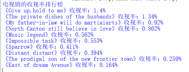 1 print("电视剧的收视率排行榜") 2 TV_plays = [('《Give up,hold to me》',1.4), 3 ('《The private dishes of the husbands》',1.34), 4 ('《My father-in-law will do martiaiarts》',0.92), 5 ('《North Canton still believe in love》',0.862), 6 ('《Impossible task》',0.553), 7 ('《Sparrow》',0.411), 8 ('《East of dream Avenue》',0.164), 9 ('《The prodigal son of the new frontier town》',0.259), 10 ('《Distant distant》',0.394), 11 ('《Music legend》',0.562), 12 ] 13 TV_plays=sorted(TV_plays,key = lambda s:s[1],reverse=True) 14 for TV_play in TV_plays: 15 print(TV_play[0]+"收视率:"+str(TV_play[1])+"%")