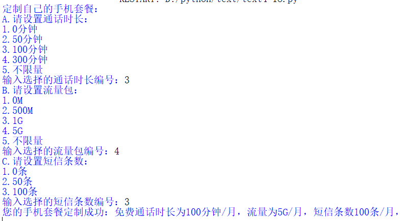 1 calling_plan = ["0分钟","50分钟","100分钟","300分钟","不限量"] 2 flow_plan = ["0M","500M","1G","5G","不限量"] 3 message_plan = ["0条","50条","100条"] 4 print("定制自己的手机套餐:") 5 #A.通话时长的选择 6 print("A.请设置通话时长:") 7 for index,calling in enumerate(calling_plan): 8 print(str(index+1)+"."+calling) 9 user_calling_plan = int(input("输入选择的通话时长编号:")) 10 while user_calling_plan > len(calling_plan) or user_calling_plan <= 0 : 11 user_calling_plan = int(input("请输入正确的套餐编号:")) 12 if 0 < user_calling_plan <= len(calling_plan): 13 break 14 numA = user_calling_plan 15 #B.流量的选择 16 print("B.请设置流量包:") 17 for index,flow in enumerate(flow_plan): 18 print(str(index+1)+"."+flow) 19 user_flow_plan = int(input("输入选择的流量包编号:")) 20 while user_flow_plan > len(flow_plan) or user_flow_plan <= 0 : 21 user_flow_plan = int(input("请输入正确的套餐编号:")) 22 if 0 < user_flow_plan <= len(flow_plan): 23 break 24 numB = user_flow_plan 25 #C.短信的选择 26 print("C.请设置短信条数:") 27 for index,message in enumerate(message_plan): 28 print(str(index+1)+"."+message) 29 user_message_plan = int(input("输入选择的短信条数编号:")) 30 while user_message_plan > len(message_plan) or user_message_plan <= 0 : 31 user_message_plan = int(input("请输入正确的套餐编号:")) 32 if 0 < user_message_plan <= len(message_plan): 33 break 34 numC = user_message_plan 35 #输出套餐结果 36 print("您的手机套餐定制成功:" 37 +"免费通话时长为"+calling_plan[numA-1]+"/月," 38 +"流量为"+flow_plan[numB-1]+"/月," 39 +"短信条数"+message_plan[numC-1]+"/月," 40 )