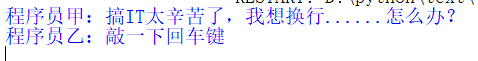 programmer_1 = '程序员甲:搞IT太辛苦了,我想换行......怎么办?' programmer_2 = '程序员乙:敲一下回车键' print(programmer_1 + '\n' + programmer_2)