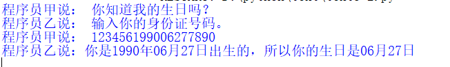 programer_1 = '你知道我的生日吗?' print('程序员甲说:',programer_1) programer_2 = '输入你的身份证号码。' print('程序员乙说:',programer_2) idcard = '123456199006277890' print('程序员甲说:',idcard) birthday = idcard[6:10] + '年' +idcard[10:12] + '月' +idcard[12:14]+'日' print('程序员乙说:''你是' + birthday + '出生的,所以你的生日是'+ birthday[5:])