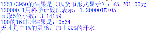 import math print('1251+3950的结果是(以货币形式显示):¥{:,.2f}元'.format(1251+3950)) print('{0:.1f}用科学计数法表示:{0:E}'.format(120000.1)) print('π取5位小数:{:.5f}'.format(math.pi)) print('{0:d}的16进制结果是:{0:#x}'.format(100)) print('天才是由{:.0%}的灵感,加上{:.0%}的汗水。'.format(0.01,0.99))