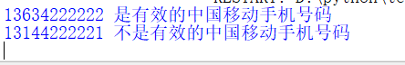 import re pattern = r'(13[4-9]\d{8})$|(15[01289]\d{8})$' mobile = '13634222222' match = re.match(pattern,mobile) if match == None: print(mobile,'表示有效的中国移动手机号码') else: print(mobile,'是有效的中国移动手机号码') mobile = '13144222221' match = re.match(pattern,mobile) if match == None: print(mobile,'不是有效的中国移动手机号码') else: print(mobile,'是有效的中国移动手机号码')