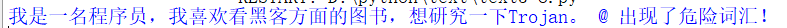 import re pattern = r'(黑客)|(抓包)|(监听)|(Trojan)' about = '我是一名程序员,我喜欢看黑客方面的图书,想研究一下Trojan。' match = re.search(pattern,about) if match == None: print(about,'@ 安全!') else: print(about,'@ 出现了危险词汇!') about = '我是一名程序员,我喜欢看计算机网络方面的图书,喜欢开发网站。' match = re.match(pattern,about)