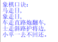 str1 = '马走日' str2 = '象走日' str3 = '车走直路炮翻车' str4 = '士走斜路护将边' str5 = '小卒一去不回还' str6 = ',' str7 = '。' print("象棋口诀:") print(str1+str6) print(str2+str6) print(str3+str6) print(str4+str6) print(str5+str7)