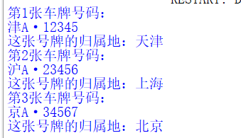 str1 = '津A·12345','沪A·23456','京A·34567' for i in range(len(str1)): print('第'+str(i+1)+'张车牌号码:\n'+str1[i]) if str1[i][0]=='津': print('这张号牌的归属地:天津') if str1[i][0]=='沪': print('这张号牌的归属地:上海') if str1[i][0]=='京': print('这张号牌的归属地:北京')