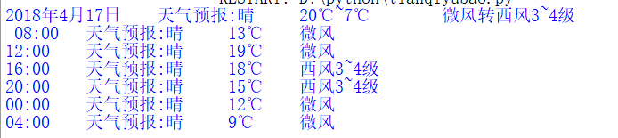 weather='2018年4月17日 \t 天气预报:{:s} \t 20℃~7℃ \t 微风转西风3~4级\n \ 08:00 \t 天气预报:{:s} \t 13℃ \t 微风\n\ 12:00 \t 天气预报:{:s} \t 19℃ \t 微风\n\ 16:00 \t 天气预报:{:s} \t 18℃ \t 西风3~4级\n\ 20:00 \t 天气预报:{:s} \t 15℃ \t 西风3~4级\n\ 00:00 \t 天气预报:{:s} \t 12℃ \t 微风\n\ 04:00 \t 天气预报:{:s} \t 9℃ \t 微风' ans = weather.format('晴', '晴', '晴', '晴', '晴', '晴', '晴') print(ans)