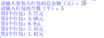 import random import decimal print("------------------------模拟微信抢红包--------------------") money = float(input("请输入要装入红包的总金额(元):")) count = int(input("请输入红包的个数(个):")) for num in range(1,count+1): if num == count: end = money else: end = random.uniform(0.01,money) end = round(end,2) money = money - end money = round(money,2) print("第" + str(count) + "个红包:" + str(end) + "元")