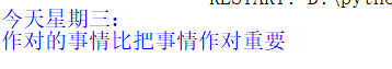 def function_tips(): '''功能:每日输出一条励志文字 ''' import datetime mot = ["今天星期一:\n坚持下去不是因为我很坚强,而是因为我别无选择", "今天星期二:\n含泪播种的人一定能笑着收货", "今天星期三:\n作对的事情比把事情作对重要", "今天星期四:\n命运给予我们的不是失望之酒,而是机会之杯", "今天星期五:\n不要等到明天,明天太遥远,今天就行动", "今天星期六:\n求知若渴,虚心若愚", "今天星期日:\n成功将属于那些从不说“不可能”的人"] day = datetime.datetime.now().weekday() print(mot[day]) function_tips()