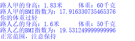 def fun_bmi(person,height,weight): '''功能:根据身高和体重计算BMI指数 person:姓名 height:身高(米) weight:体重(千克) ''' print(person + "的身高:" + str(height) + "米\t 体重:" + str(weight) + "千克") bmi=weight/(height*height) print(person +"的BMI指数为:"+str(bmi)) #判断身材是否合理 if bmi<18.5 : print("你的体重过轻") if bmi>=18.5 and bmi<24.9: print("正常范围,注意保持") if bmi>=24.9 and bmi<29.9 : print("你的体重过重") if bmi>=29.9 : print("肥胖") fun_bmi("路人甲",1.83,60) fun_bmi("路人乙",1.60,50)