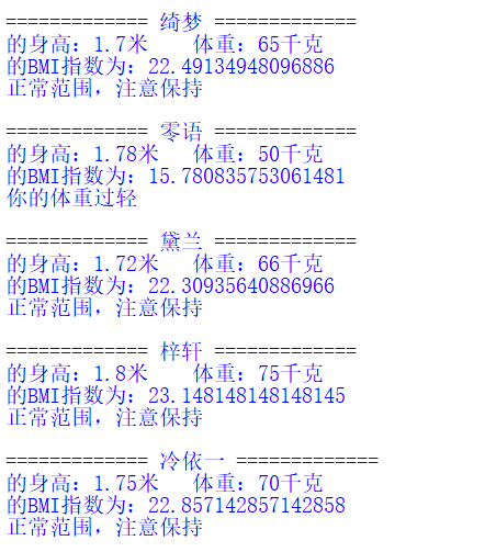 def fun_upgrade(*person): '''功能:根据身高和体重计算BMI指数(共享升级版) *person:可变参数该参数中需要传递带3个元素的列表 分别为姓名\身高(单位:米)和体重(单位:千克) ''' for list_person in person: for item in list_person: person = item[0] height = item[1] weight = item[2] print("\n" + "="*13,person,"="*13) print( "的身高:" + str(height) + "米\t 体重:" + str(weight) + "千克") bmi=weight/(height*height) print("的BMI指数为:"+str(bmi)) #判断身材是否合理 if bmi<18.5 : print("你的体重过轻") if bmi>=18.5 and bmi<24.9: print("正常范围,注意保持") if bmi>=24.9 and bmi<29.9 : print("你的体重过重") if bmi>=29.9 : print("肥胖") list_w = [('绮梦',1.70,65),('零语',1.78,50),('黛兰',1.72,66)] list_m = [('梓轩',1.80,75),('冷依一',1.75,70)] fun_upgrade(list_w,list_m)