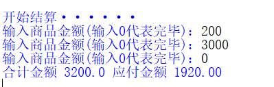 def fun_checkout(money): '''功能:计算商品合计金额并进行折扣处理 money:保存商品金额的列表 返回商品的合计金额和折扣后的金额 ''' money_old = sum(money) money_new = money_old if 500 <= money_old < 1000: money_new = '{:.2f}'.format(money_old*0.9) elif 1000 <=money_old <2000: money_new = '{:.2f}'.format(money_old*0.8) elif 2000 <= money_old <3000: money_new = '{:.2f}'.format(money_old*0.7) elif money_old >=3000: money_new = '{:.2f}'.format(money_old*0.6) return money_old,money_new print("\n开始结算······") list_money = [] while True: inmoney = float(input("输入商品金额(输入0代表完毕):")) if int(inmoney) == 0: break else: list_money.append(inmoney) money = fun_checkout(list_money) print("合计金额",money[0],"应付金额",money[1])