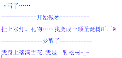 pinetree = '我是一颗松树' def fun_christmastree(): '''功能:一个梦 无返回值 ''' pinetree = '挂上彩灯、礼物……我变成一颗圣诞树@^.^@\n' print(pinetree) print('\n下雪了……\n') print('============开始做梦==========\n') fun_christmastree() print('==============梦醒了===========\n') pinetree = '我身上落满雪花,'+ pinetree+'-_-' print(pinetree)