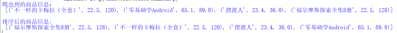 bookinfo = [('不一样的卡梅拉(全套)',22.50,120),('零基础学Android',65.10,89.80),('摆渡人',23.40,36.00),('福尔摩斯探索全集8册',22.50,128)] print('爬虫到的商品信息:\n',bookinfo,'\n') bookinfo.sort(key = lambda x:(x[1],x[1]/x[2])) print('排序后的商品信息:\n',bookinfo)