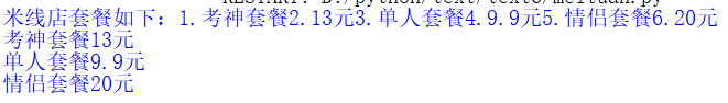 def taocan(a,b,c,d,e,f): print("米线店套餐如下:1."+ a +'2.'+ b+'3.'+c+'4.'+d+'5.'+e+'6.'+f) print(a+b) print(c+d) print(e+f) taocan('考神套餐','13元','单人套餐','9.9元','情侣套餐','20元')