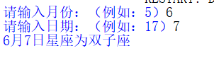 m=("摩羯座","水瓶座","双鱼座","白羊座","金牛座","双子座","巨蟹座","狮子座","处女座","天秤座","天蝎座","射手座","摩羯座") d=(20,19,21,20,21,22,23,23,23,24,23,22) def xingzuo(month,day): if day<d[month-1]: return m[month-1] else: return m[month] M=int(input("请输入月份:(例如:5)")) D=int(input("请输入日期:(例如:17)")) print(str(M)+'月'+str(D)+'日星座为'+xingzuo(M,D))