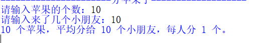 def division(): '''功能:分苹果''' print("\n======================分苹果了===================") apple = int(input("请输入苹果的个数:")) children = int(input("请输入来了几个小朋友:")) result = apple//children remain = apple-result*children if remain>0: print(apple,"个苹果,平均分给",children,"个小朋友,每人分",result,"个,剩下",remain,"个。") else: print(apple,"个苹果,平均分给",children,"个小朋友,每人分",result,"个。") if __name__=='__main__': division()