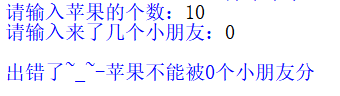 def division(): '''功能:分苹果''' print("\n======================分苹果了===================") apple = int(input("请输入苹果的个数:")) children = int(input("请输入来了几个小朋友:")) result = apple//children remain = apple-result*children if remain>0: print(apple,"个苹果,平均分给",children,"个小朋友,每人分",result,"个,剩下",remain,"个。") else: print(apple,"个苹果,平均分给",children,"个小朋友,每人分",result,"个。") if __name__=='__main__': try: division() except ZeroDivisionError: print("\n出错了~_~-苹果不能被0个小朋友分")