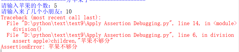 def division(): '''功能:分苹果''' print("\n======================分苹果了===================") apple = int(input("请输入苹果的个数:")) children = int(input("请输入来了几个小朋友:")) assert apple>children,"苹果不够分" result = apple//children remain = apple-result*children if remain>0: print(apple,"个苹果,平均分给",children,"个小朋友,每人分",result,"个,剩下",remain,"个。") else: print(apple,"个苹果,平均分给",children,"个小朋友,每人分",result,"个。") if __name__=='__main__': division()