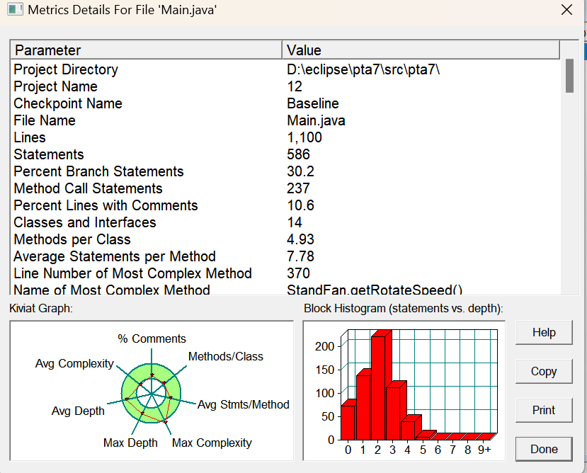 从报表内容可以看到以下关键指标:文件代码总行1100,语句共586,百分比分支语句为30.2,方法调用语句为237,带注释行百分比为10.6,类和接口共14个,每个类的平均方法为1.93,每个类的平均语句数为7.78,最复杂方法共370行。