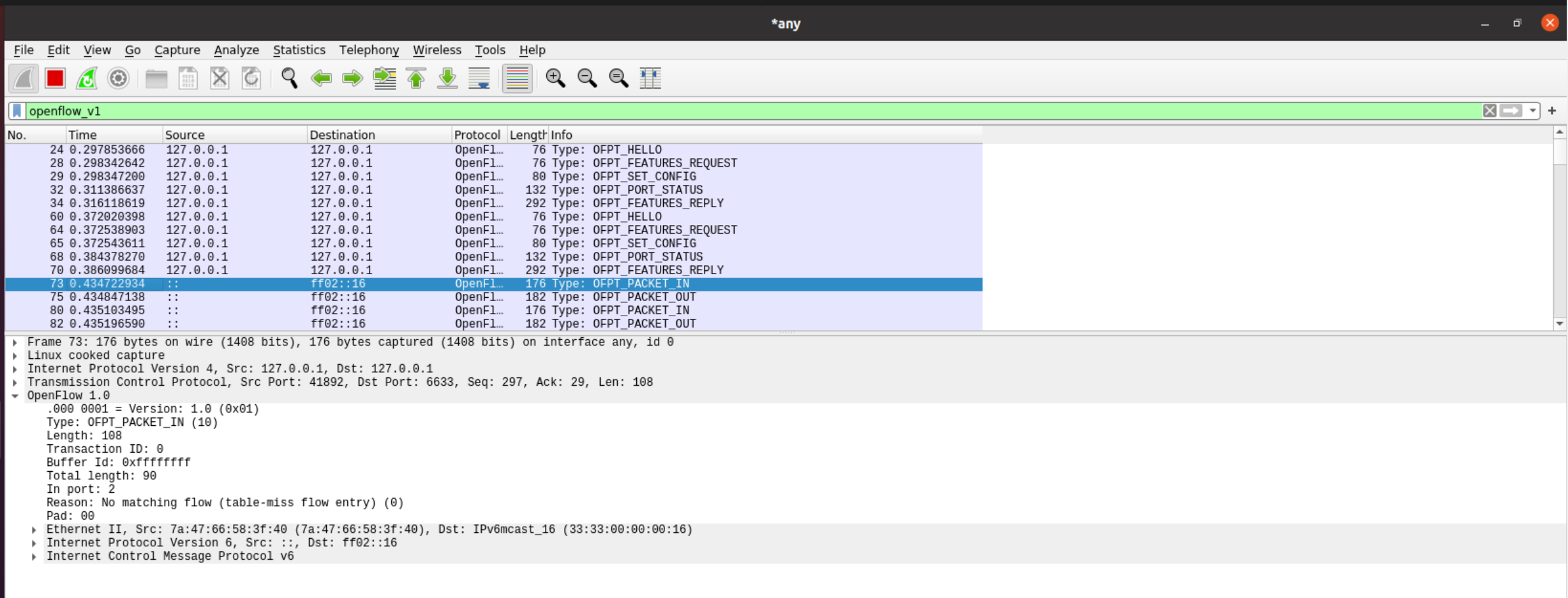 2.通过过滤器输入“openflow_V4”时没有发现HELLO数据包