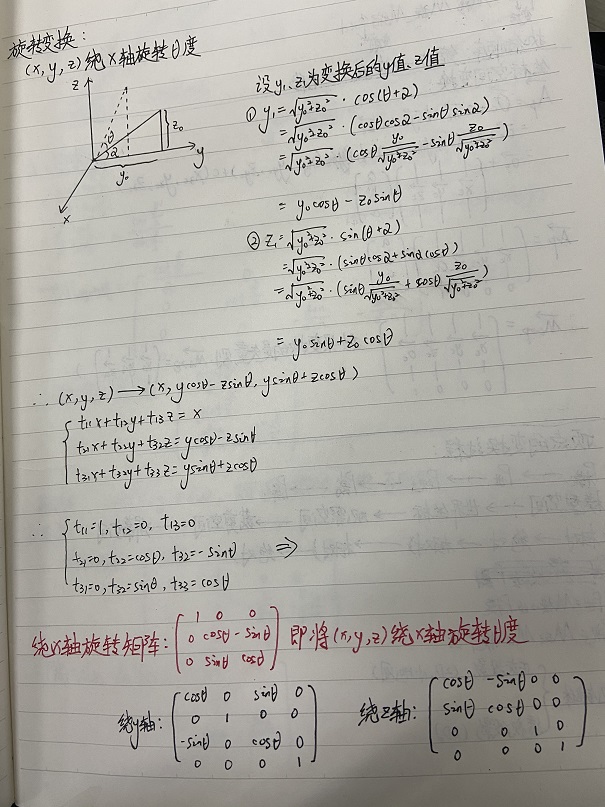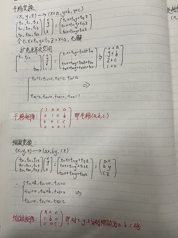 平移矩阵、放缩矩阵和旋转矩阵的推导我写在了笔记本上(因为html不好编辑公式和图像),如下: