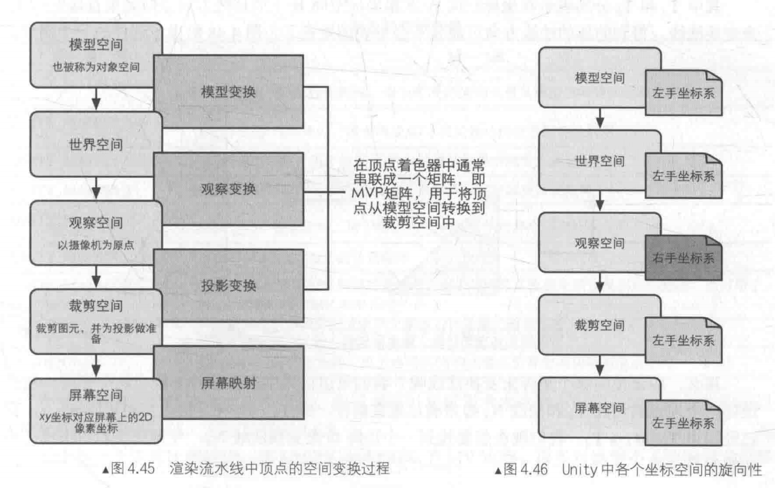 顶点着色器的作用是对顶点进行预处理,其中最重要的一步是进行坐标变换。顶点本身的坐标是以模型空间的锚点作为原点的,顶点着色器需要将顶点转移到我们想要的空间系中,就需要历经以下过程:模型空间->世界空间->观察空间->裁剪空间,这一步的流程可以参考下图: