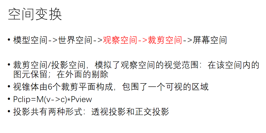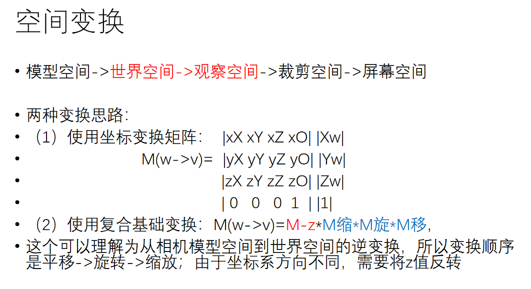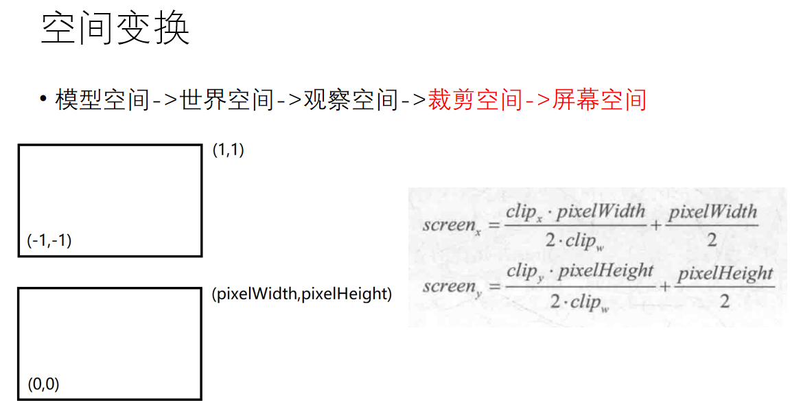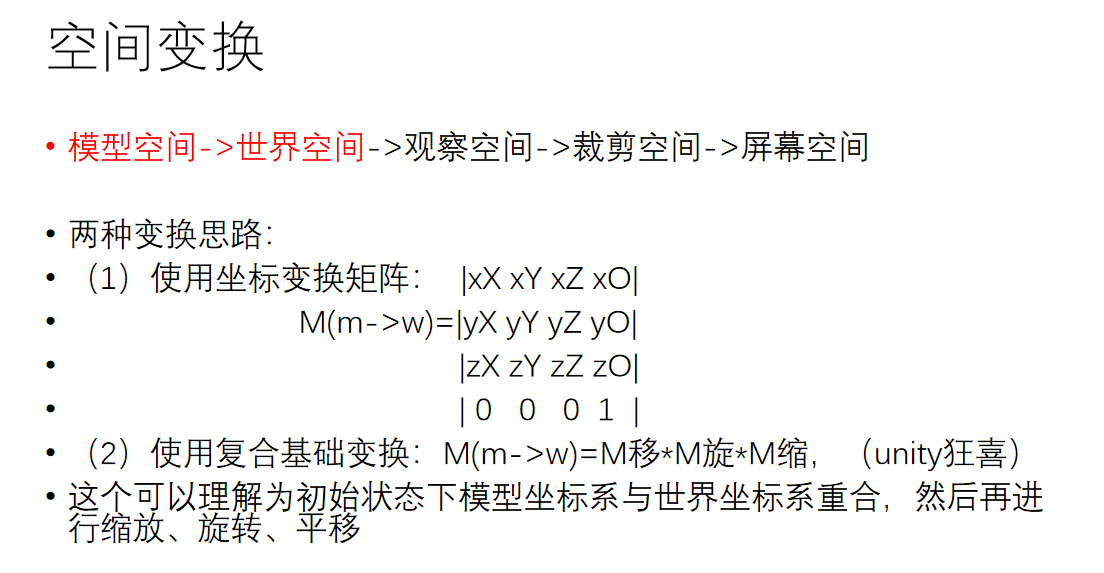 这里我们来简单谈谈空间变换。它的概念在unity渲染管线那篇文章中有详细介绍,大概就是要从模型空间变换到世界空间、变换到视角空间、变换到裁剪空间、变换到ndc空间、变换到屏幕坐标。因为这部分属于图形学入门的知识,再加上自己太懒不想打太多数学符号,因此直接上几张自己曾经做过的白板ppt:
