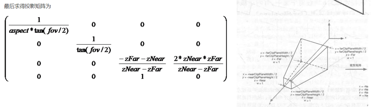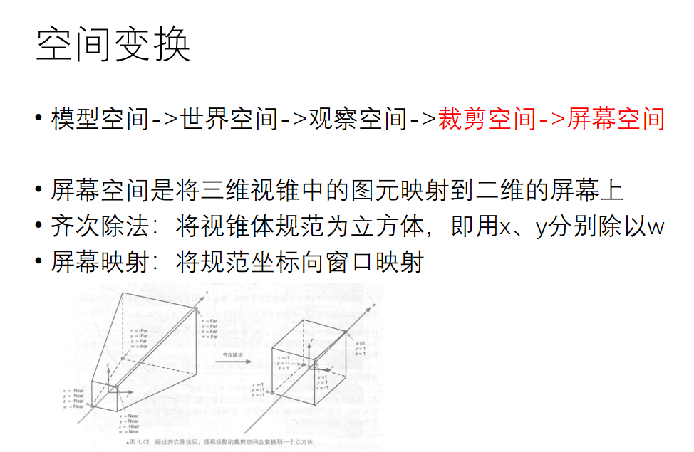 其中lookat矩阵是从世界空间转换到视角空间的矩阵,perspective矩阵是从视角空间转换到裁剪空间的矩阵,viewport是从ndc空间转换到屏幕坐标的矩阵,要注意的是中间其实还有一步从裁剪空间坐标转移到ndc空间的变换,方法很简单,只需要给x、y、z、w都除以w即可,因此我没有单写它的矩阵,但大家千万不要忘了这一步。
