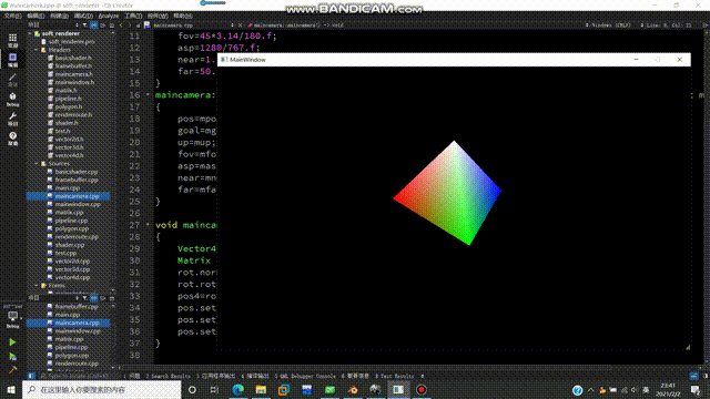 现在我们得到了一个相机类。相机需要在执行渲染管线之前被创建出来,因此我们在renderroute类的loop中实例化一个相机类:maincamera *camera=new maincamera; 然后在渲染循环中把相机传入:pipeline->drawIndex(Pipeline::Fill,camera);