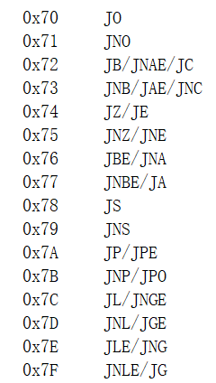 条件跳转,后跟四个字节立即数的偏移(有符号),共六个字节。