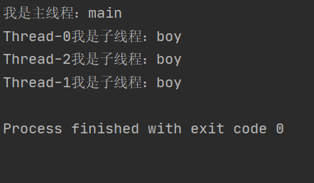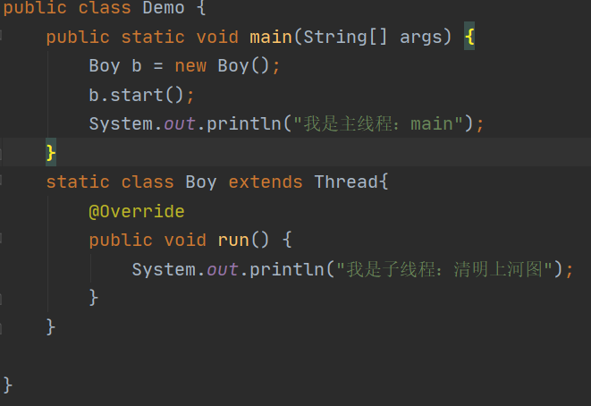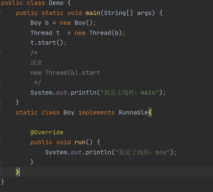 1 public static void main(String[] args) { 2 Boy b = new Boy(); 3 new Thread(b).start(); 4 new Thread(b).start(); 5 new Thread(b).start(); 6 /* 7 或者 8 Thread t1 = new Thread(b); 9 t1.start(); 10 Thread t2 = new Thread(b); 11 t2.start(); 12 Thread t3 = new Thread(b); 13 t3.start(); 14 */ 15 System.out.println("我是主线程:main"); 16 } 17 static class Boy implements Runnable{ 18 19 @Override 20 public void run() { 21 System.out.println(Thread.currentThread().getName()+"我是子线程:boy"); 22 } 23 }