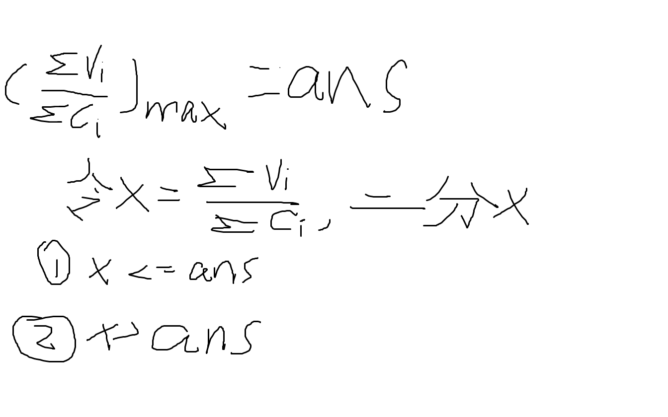 那么我们只需要二分x求出最大的x即可,因此我们只需求出所有v-x*c的值并把最大的k个求和保证sum>=0即可。