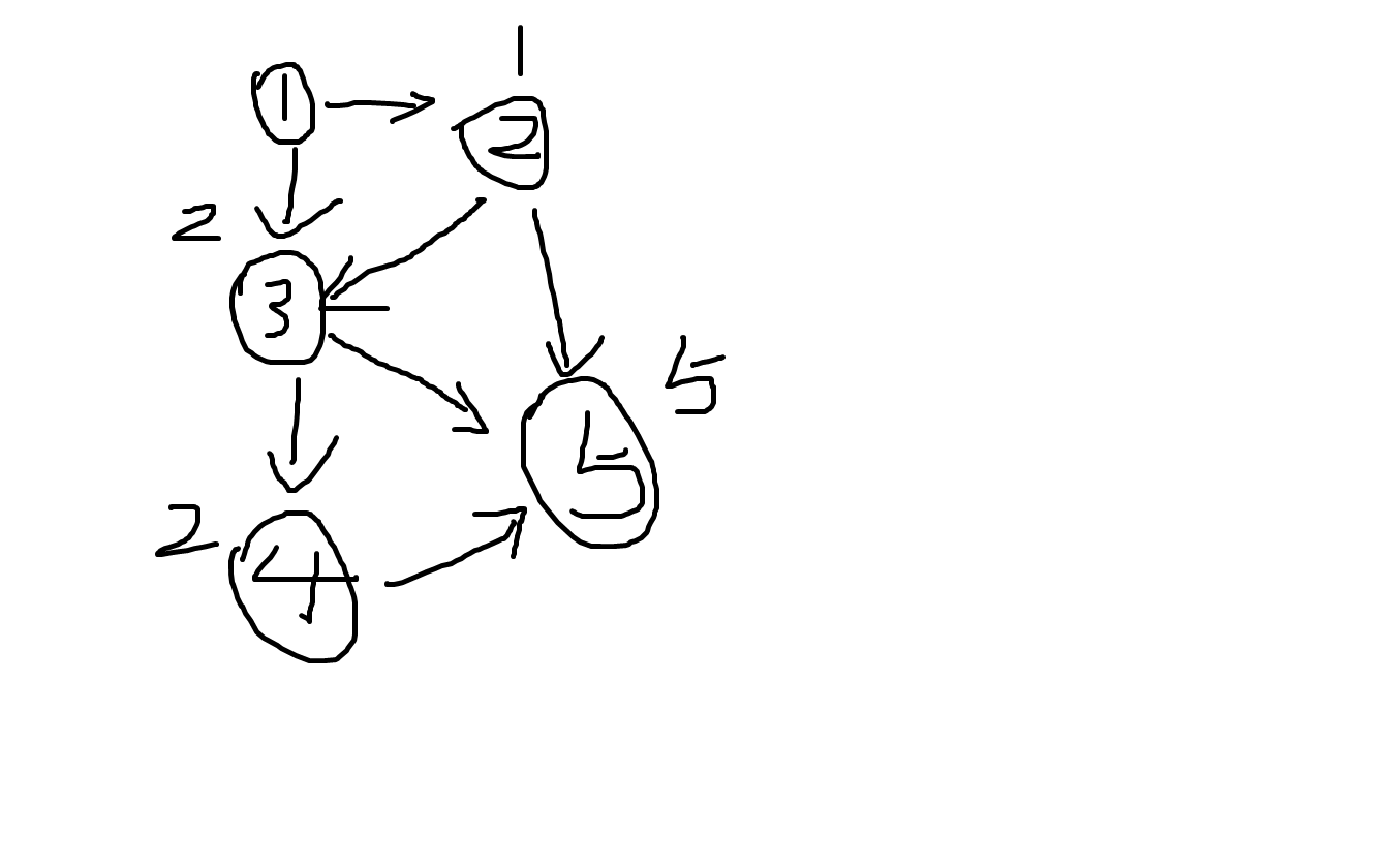 首先这题是一个有向无环图,如图,每个结点上方显示的是到达该节点的路径数,我们不难发现每个结点的路径数都由其入度结点的路径数之和,最终得出5结点的路径数。那么由此我们只需要求出每个无出度结点的路径数再相加即可。