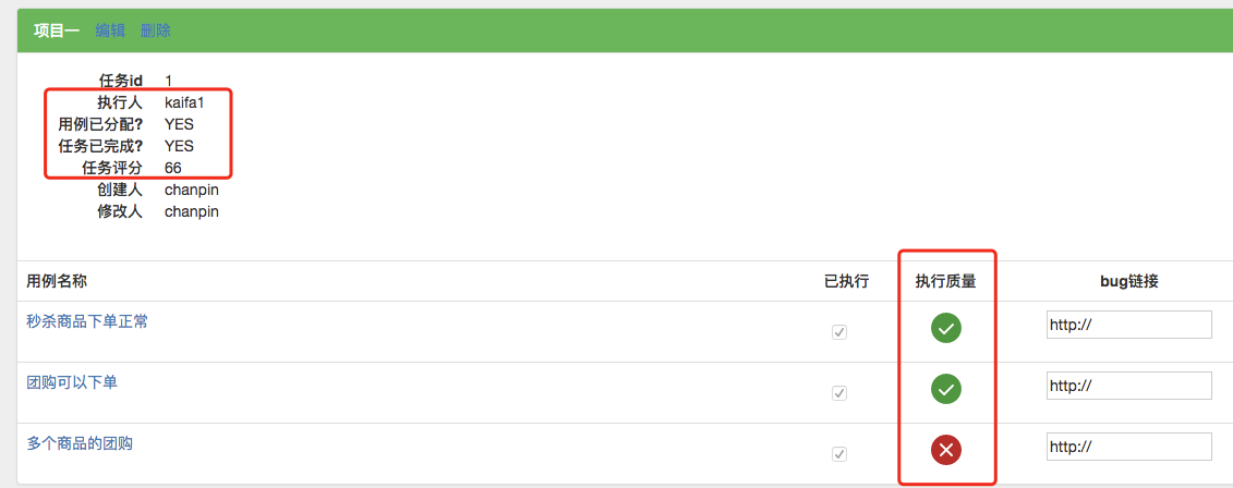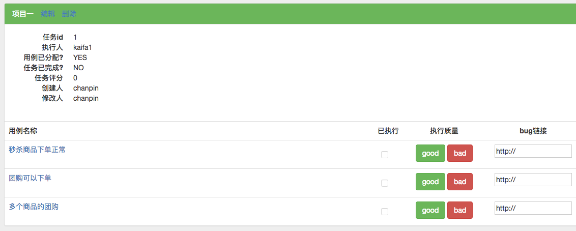 测试人员一条条检查下去,功能无误点击good按钮,执行不到位点击bad按钮(可以将bug链接填写上去),当项目下的用例全部执行完成以后会在项目概况下自动打分