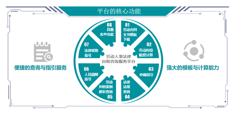 平台以劳动者角度和需求切入,通过其便捷的查询与指引服务、强大的模板与计算能力,为广大劳动者提供全方位的法律服务,既能法律咨询、获得文书,又可获得救济途径指引, 帮助劳动者解决问题。主要有以下功能:
