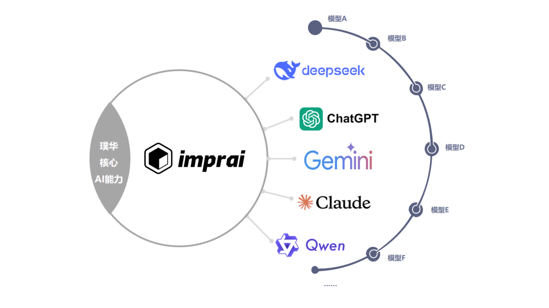 英璞来通过DeepSeek、ChatGPT、Gemini、Claude、Qwen等主流模型主流模型的灵活配置,结合行业特点,可以优化生产流程、革新教育模式、升级金融服务……实现快速、高效、全面的智能体验。