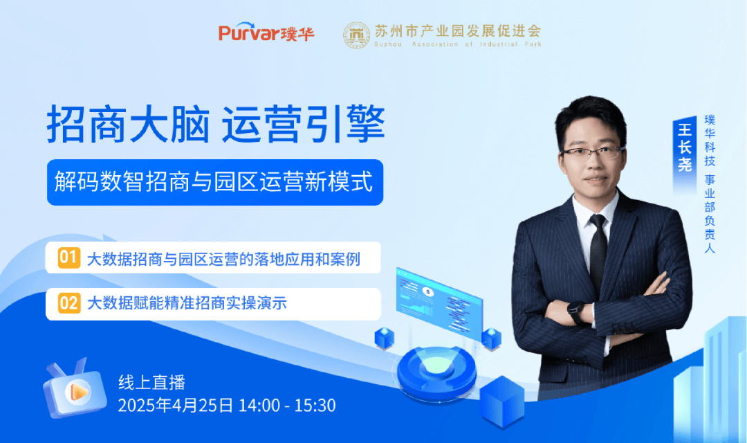 2025年4月25日,由璞华科技有限公司联合苏州市产业园发展促进会主办的“「招商大脑 · 运营引擎」解码大数据招商与智慧园区运营新模式”线上公开课活动成功举办。本次活动聚焦大数据技术在产业招商与园区运营中的创新应用,吸引了来自全国产业园区、企业及行业专家的广泛参与,共同探讨数字化转型背景下园区高质量发展的新路径。