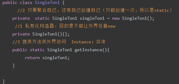 2、该单例对象必须由单例类自行创建(自己new自己)