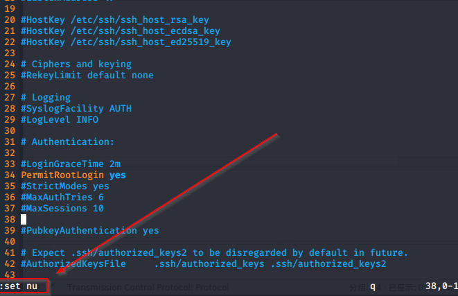 2.先按esc键(键盘左上角),再输入 :set nu (注意冒号是英文状态下),回车显示行号