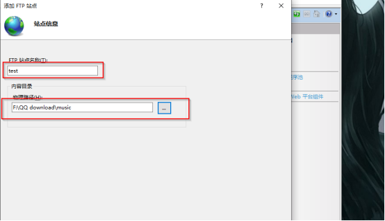 6.右键空白处,添加ftp站点,填写名称和路径(路径下可以放点东西),这里最好写英文,避免出错。