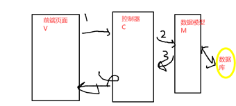 前端页面请求(V) 到 控制器(C)中,控制器调用 数据模型(M)获取数据库的数据,然后在通过控制器将数据返回给前端页面(V)