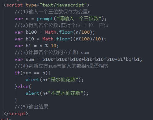 什么是水仙花数:一定是一个3位整数,各个位数的立方 相加 等于本身153 =13+5³+3³=1+125+27=153 153就是一个水仙花数