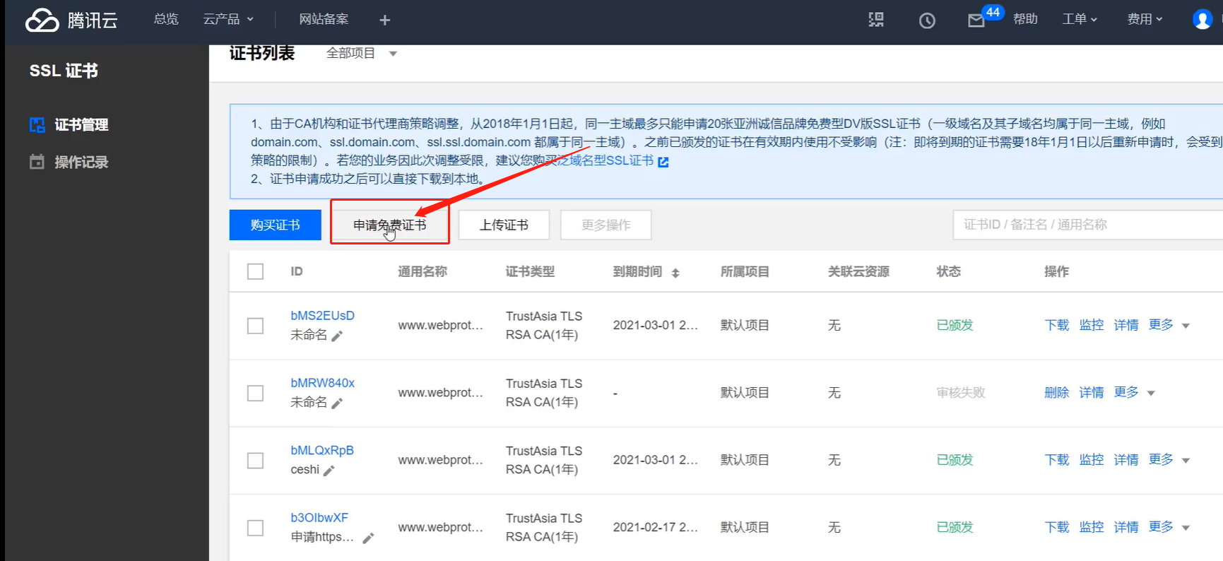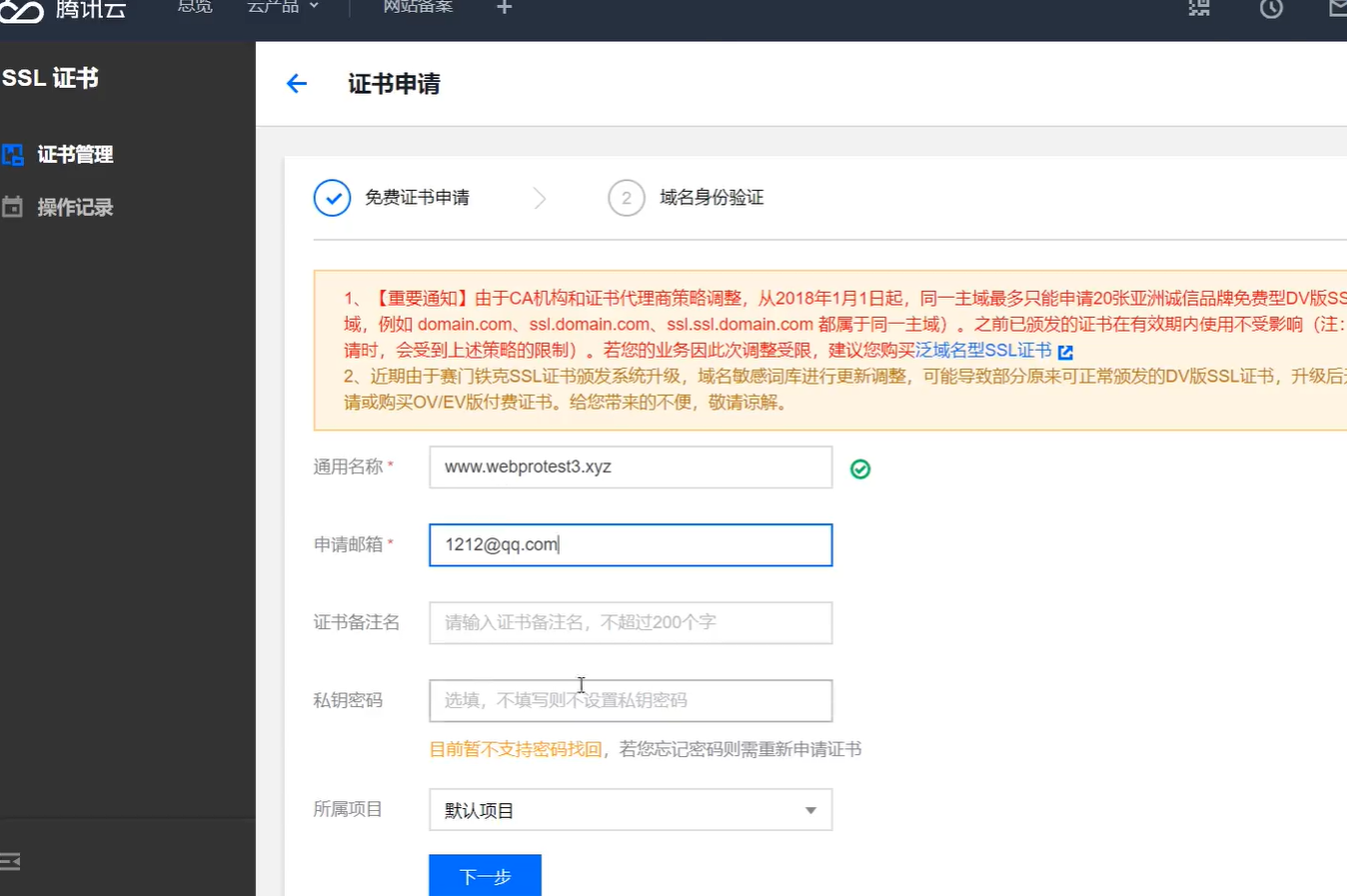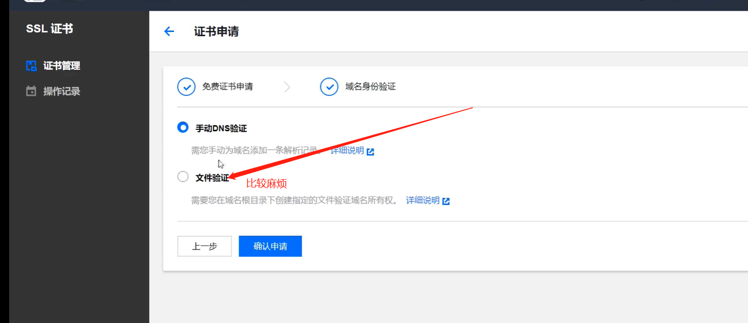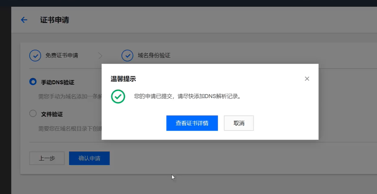 1.在腾讯云证书管理页面选择免费SSL证书申请,填写详细信息后,手动DNS验证。