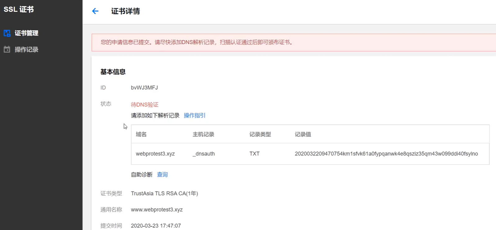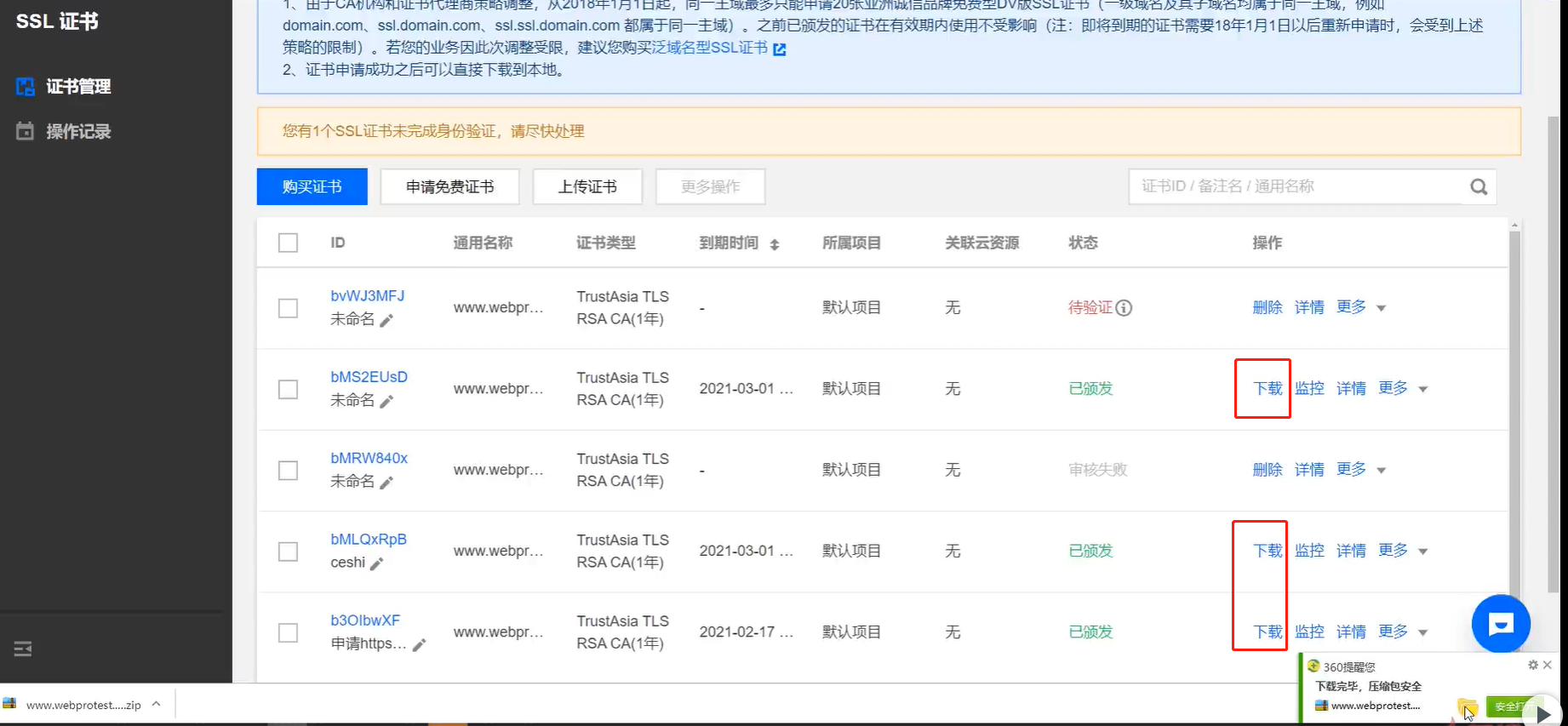 当对应的服务商,扫描到对应的解析记录的时候对应的证书就可以下载了。