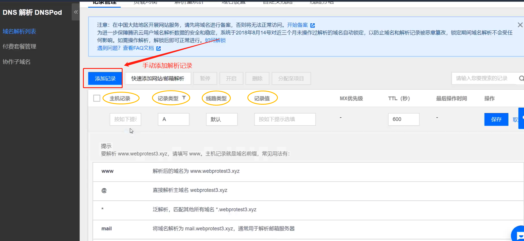 把以上解析路径,填写在域名解析列表中的添加记录页面里面(线路类型:默认)