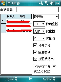 其实现的原理很简单,即:拨打订票电话---在设定的时间里未通----继续拨打-----若接通了----则振动设备并退出重拨软件。